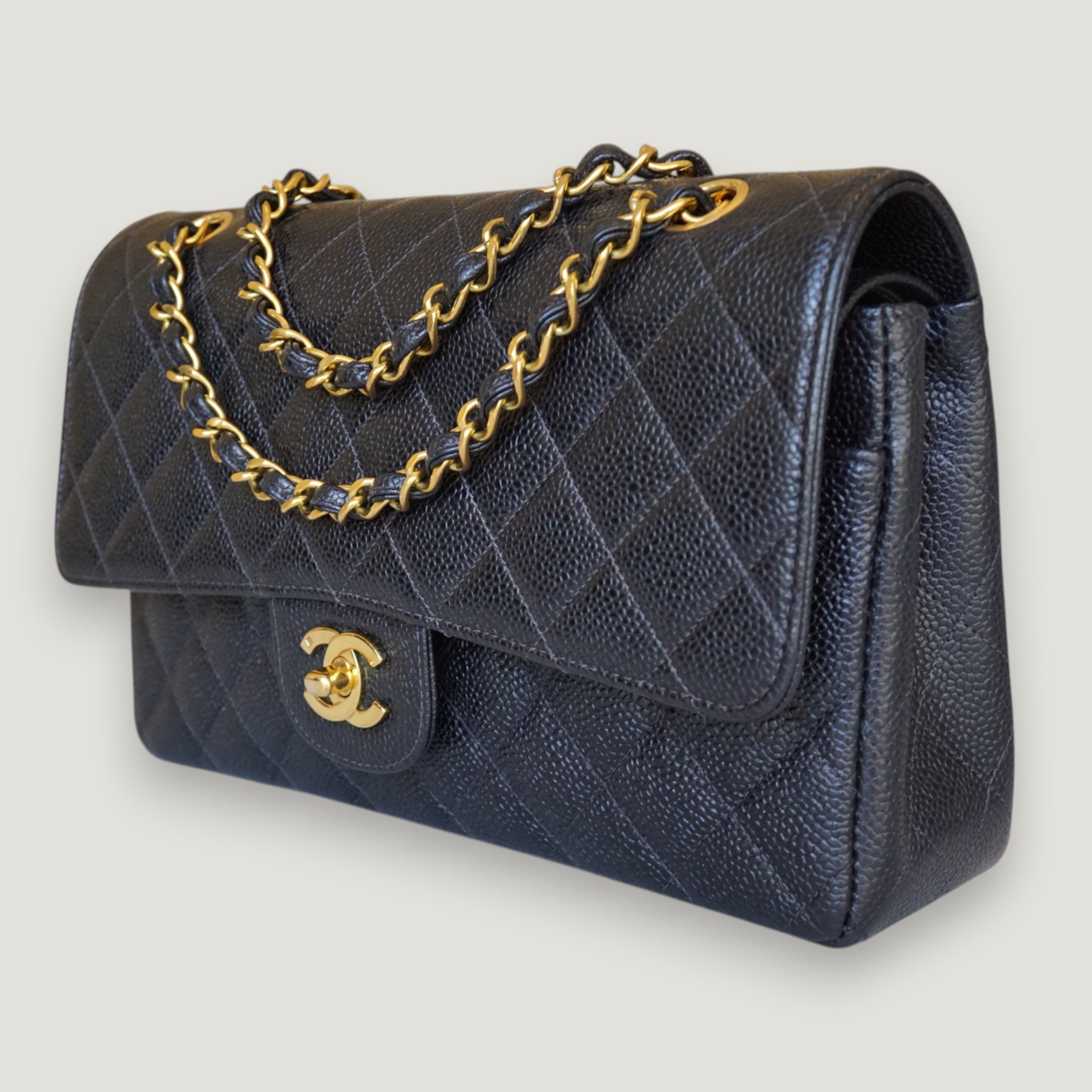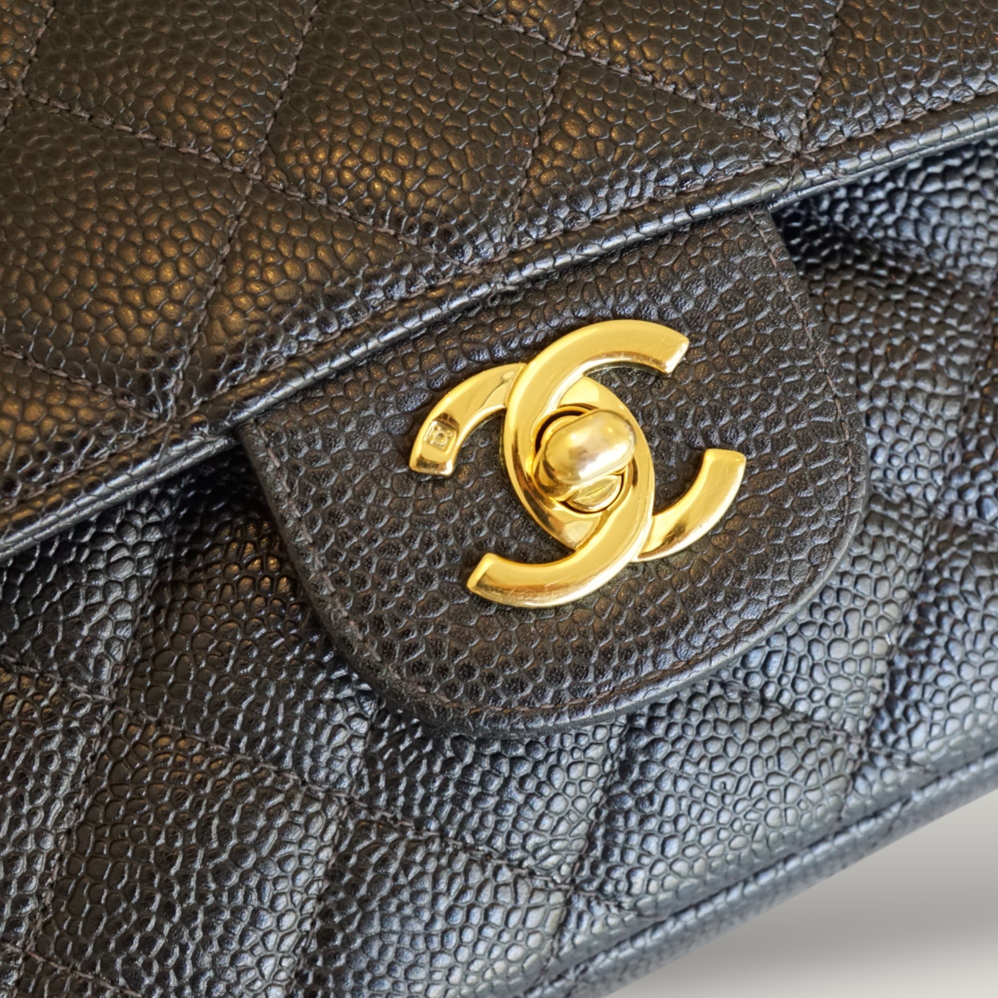 - Materials: caviar leather, gold-plated hardware