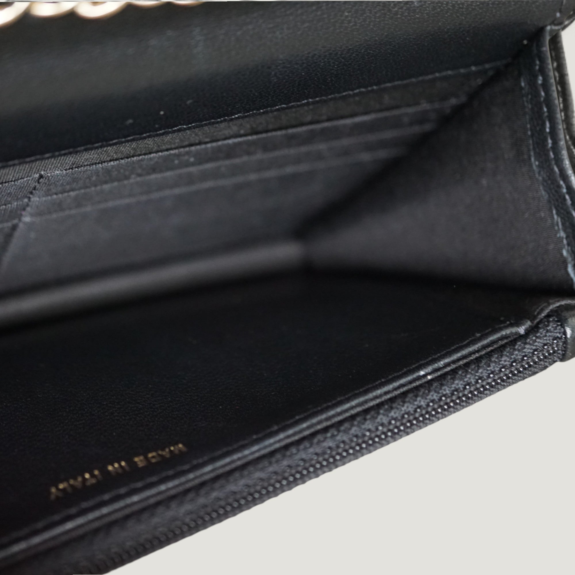 - Materials: lambskin leather, champagne gold-tone hardware